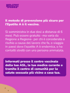 Ma il metodo di prevenzione più sicuro è il vaccino. Si somministra in due dosi a distanza di 6 mesi. Può essere gratuito, ma varia da Regione a Regione, per chi è consideratə a rischio a causa del lavoro che fa, o perché viaggia in paesi dove l’epatite A è endemica, o perché ha contatti stretti con una persona ammalata. Ci si può informare presso il centro vaccinale della propria ASL o presso lə propriə medicə curante.
