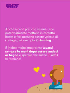 Anche alcune pratiche sessuali che potenzialmente mettono in contatto bocca e feci possono essere veicolo di contagio, ad esempio, il rimming.